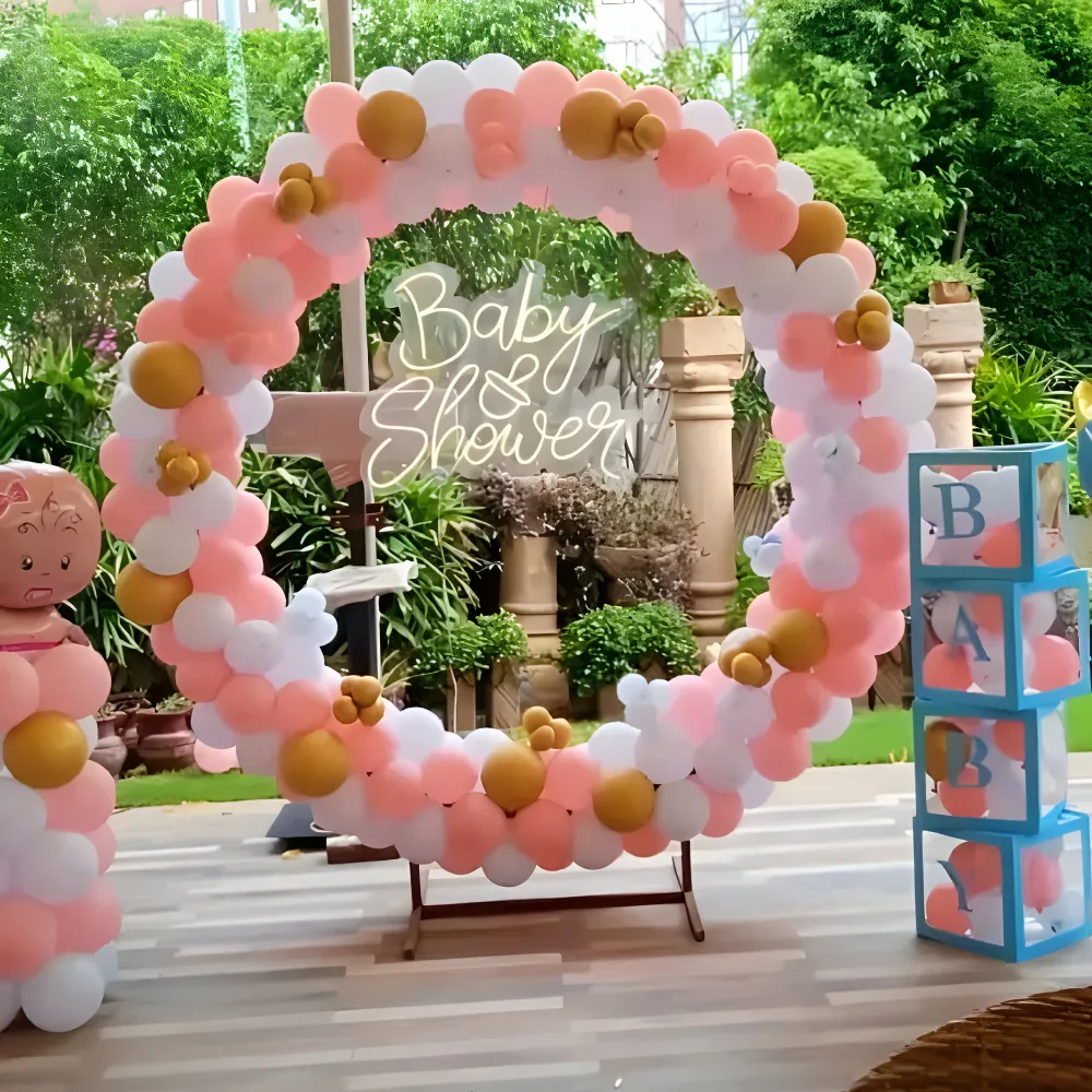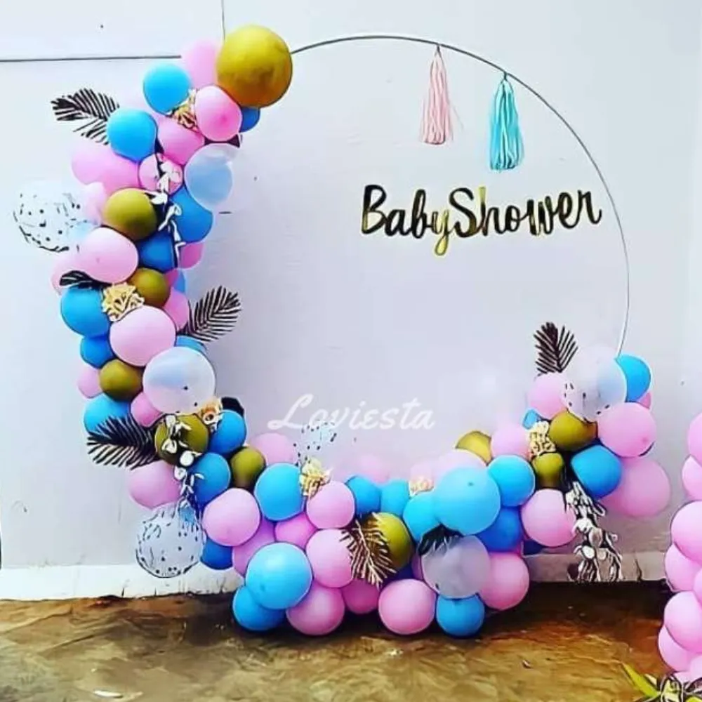 This elegant baby shower decoration package is thoughtfully designed to create a dreamy and celebratory atmosphere filled with soft colors and charming details. The generous arrangement of pastel balloons in soothing shades of blue and pink brings a balanced and joyful look, making the space feel warm, welcoming, and visually enchanting. These balloons beautifully frame the setup and add volume and softness, making the decoration ideal for photos and memorable moments. The iron ring stand serves as a stylish base for the entire arrangement, giving the decoration a modern and well-structured appearance while enhancing the overall presentation.