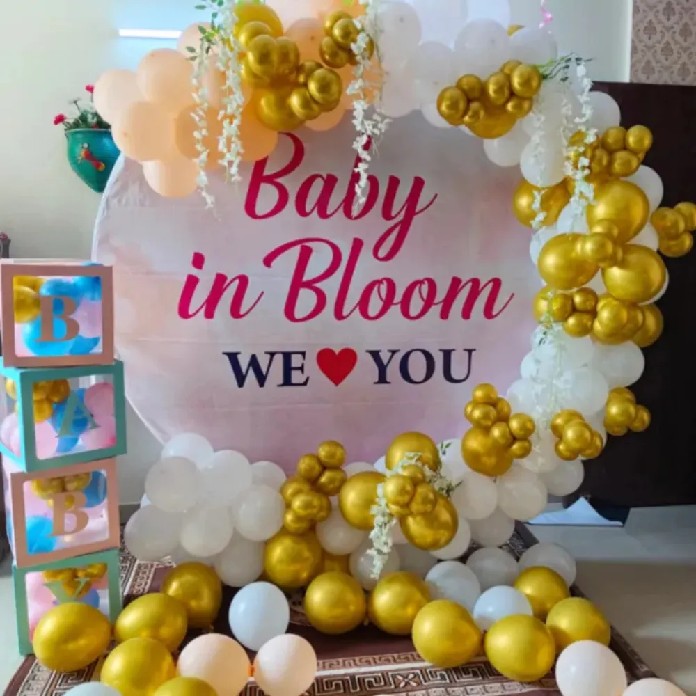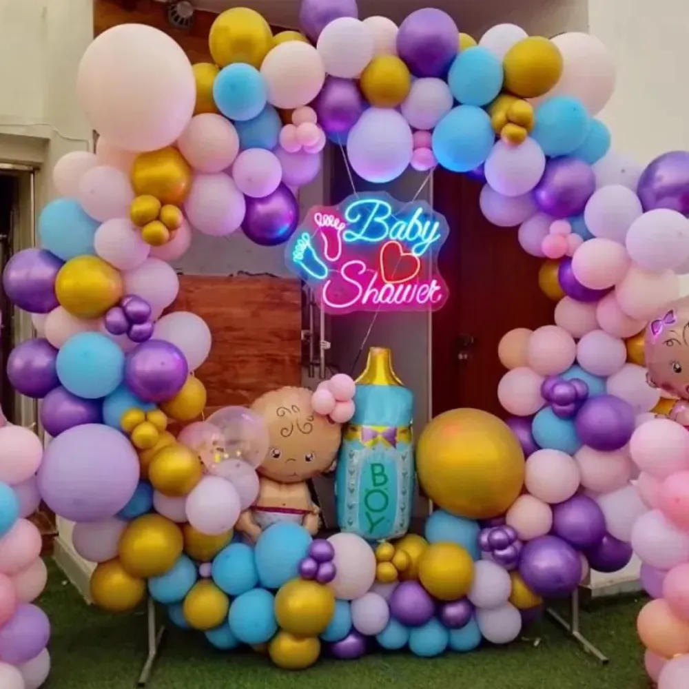 The large printed flex backdrop paired with the glowing “Baby Shower” neon light becomes the focal point of the setup, instantly drawing attention and setting the perfect tone for the celebration. Bladder balloons add a unique texture, while the baby-themed foil elements such as feet, bottles, and adorable baby boy and baby girl props bring a playful and heartfelt charm to the décor. The big star foils add a touch of sparkle and elegance, completing the look beautifully. Ribbons ensure the balloons are neatly arranged, giving the setup a clean and professional finish. This package is perfect for creating a magical baby shower celebration that feels joyful, stylish, and unforgettable.