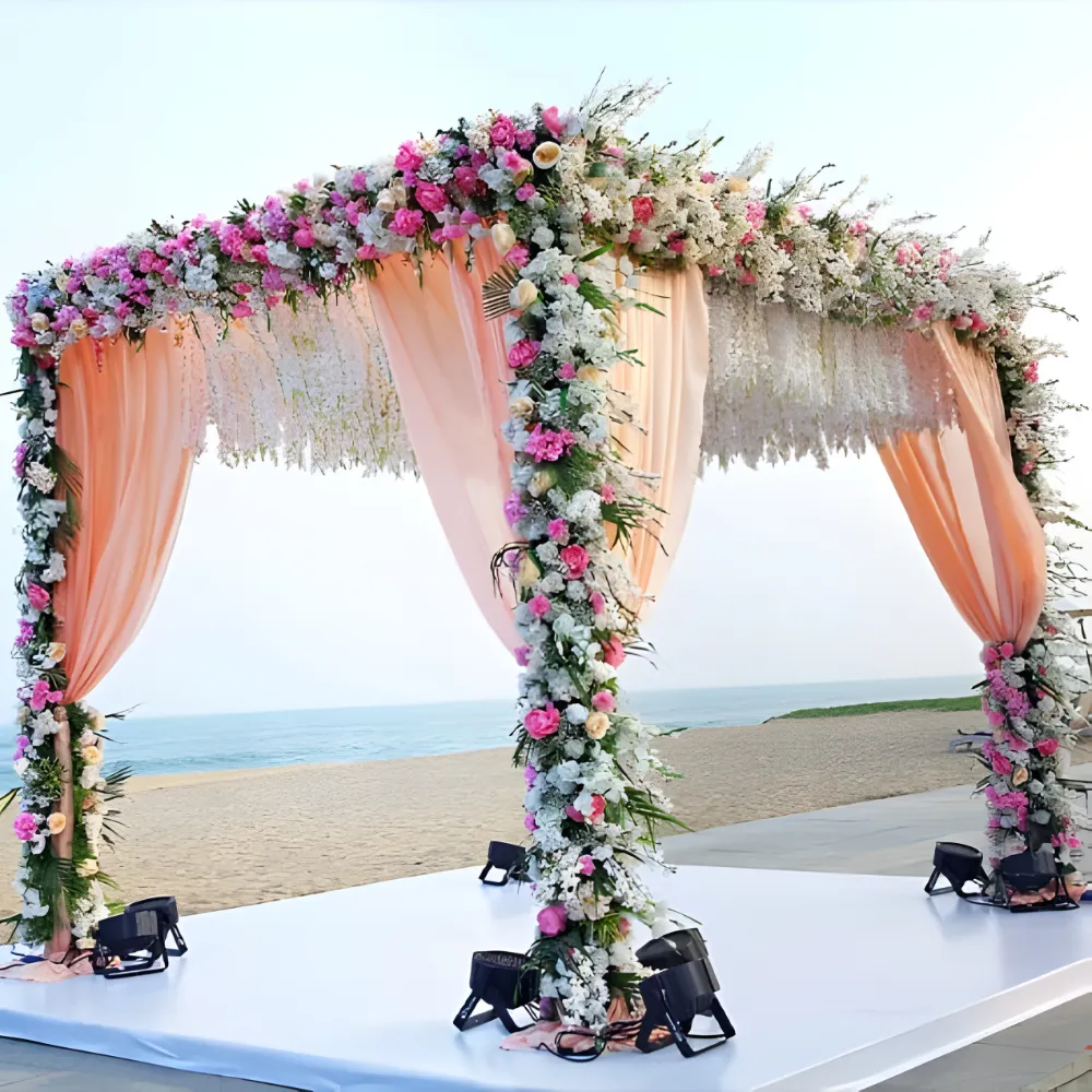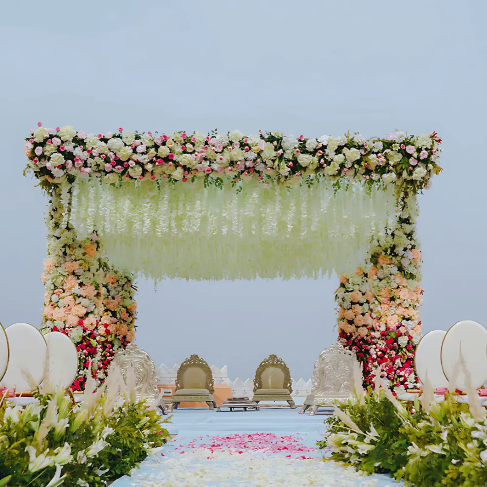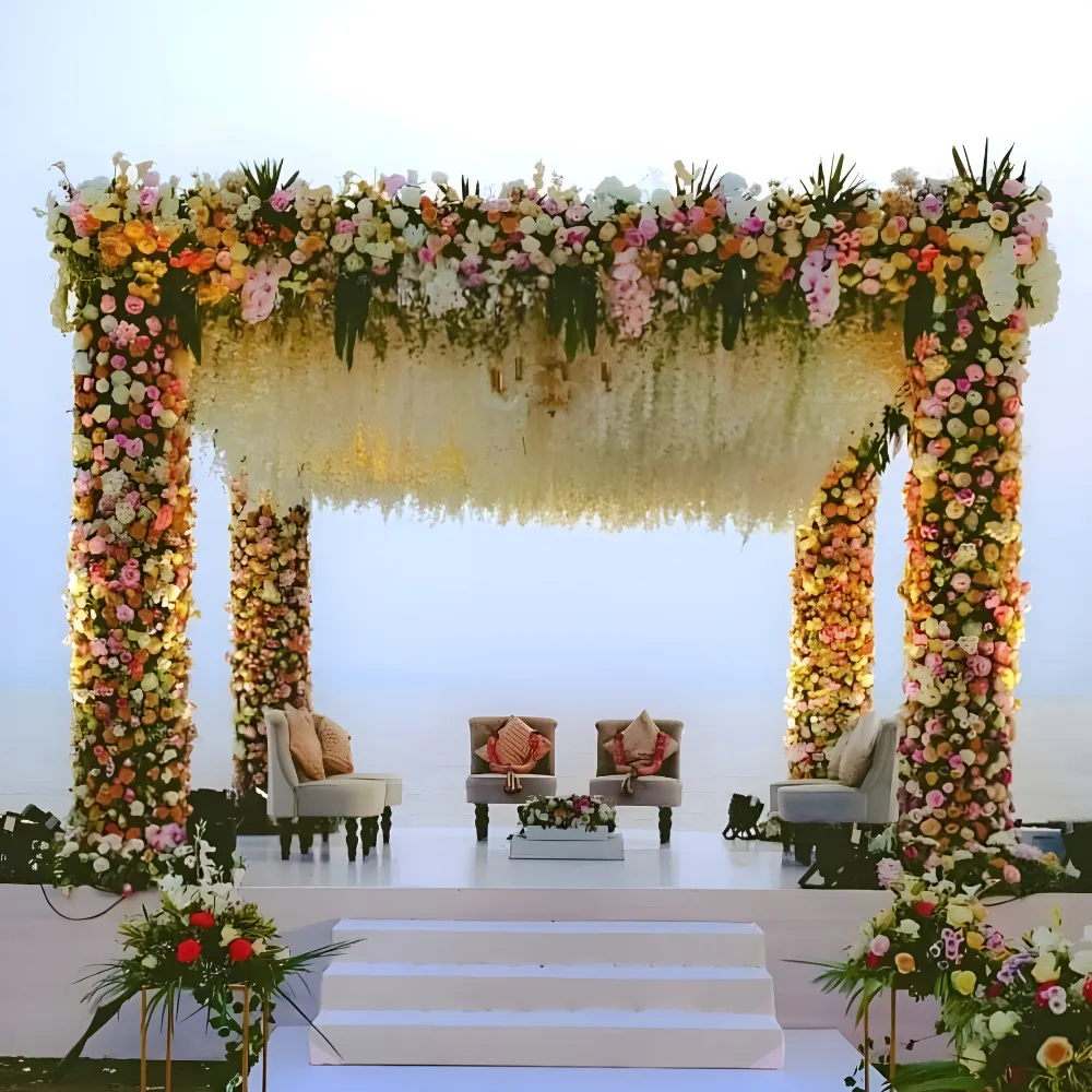 This beautiful mandap decoration creates an enchanting and vibrant setting, perfect for weddings and traditional ceremonies. The centerpiece is a spacious twelve-by-twelve–foot mandap, providing ample space for rituals while creating a grand and inviting focal point. Rajani gandha chains hang gracefully from the structure, adding a touch of elegance, fragrance, and traditional charm that enhances the spiritual ambiance. White cartons shaped like apples are creatively incorporated, introducing a playful yet sophisticated design element that contrasts beautifully with the vibrant floral arrangements. Multicolor flowers combined with lush green leaves are thoughtfully placed throughout, adding freshness, vibrancy, and a lively natural touch that brightens the mandap. The combination of bold colors, greenery, and delicate hanging chains creates a harmonious and visually appealing décor that is both photogenic and culturally meaningful. Altogether, this mandap decoration transforms the ceremony space into a beautiful, festive, and memorable setting, ensuring that every ritual and photograph is framed in elegance and charm. The thoughtful layering of floral elements, greenery, and creative design details makes this setup ideal for celebrating love, tradition, and joyous moments in a visually stunning environment.