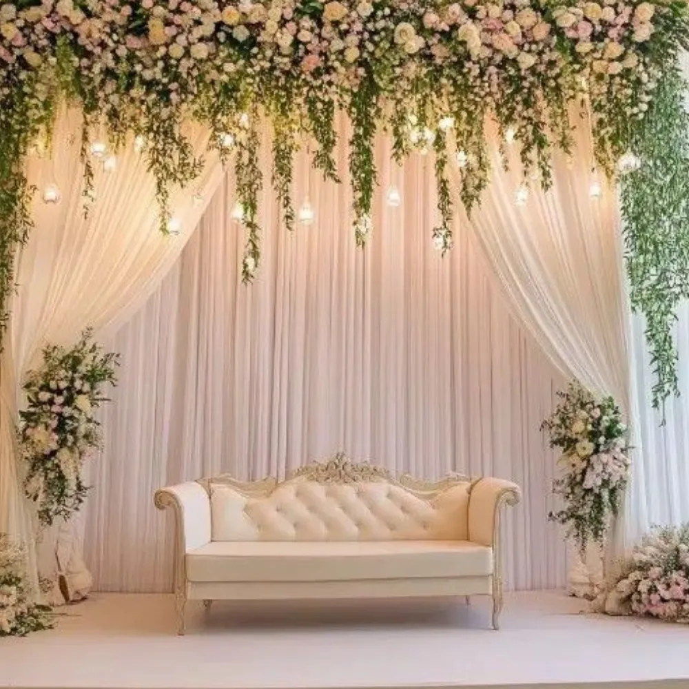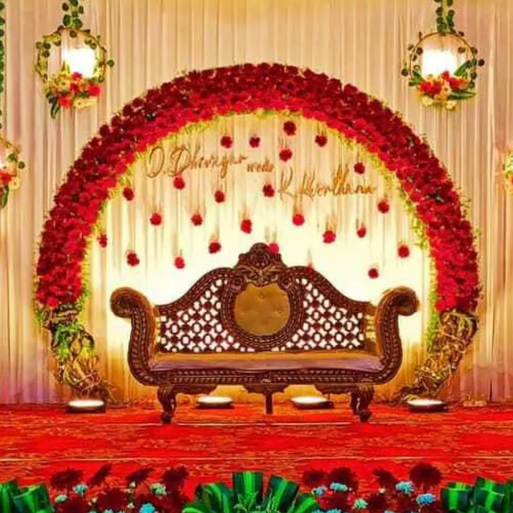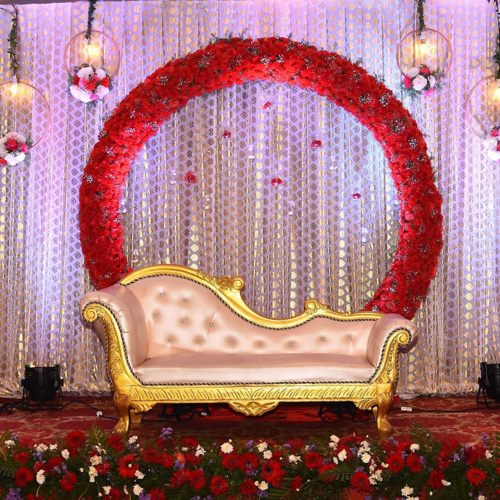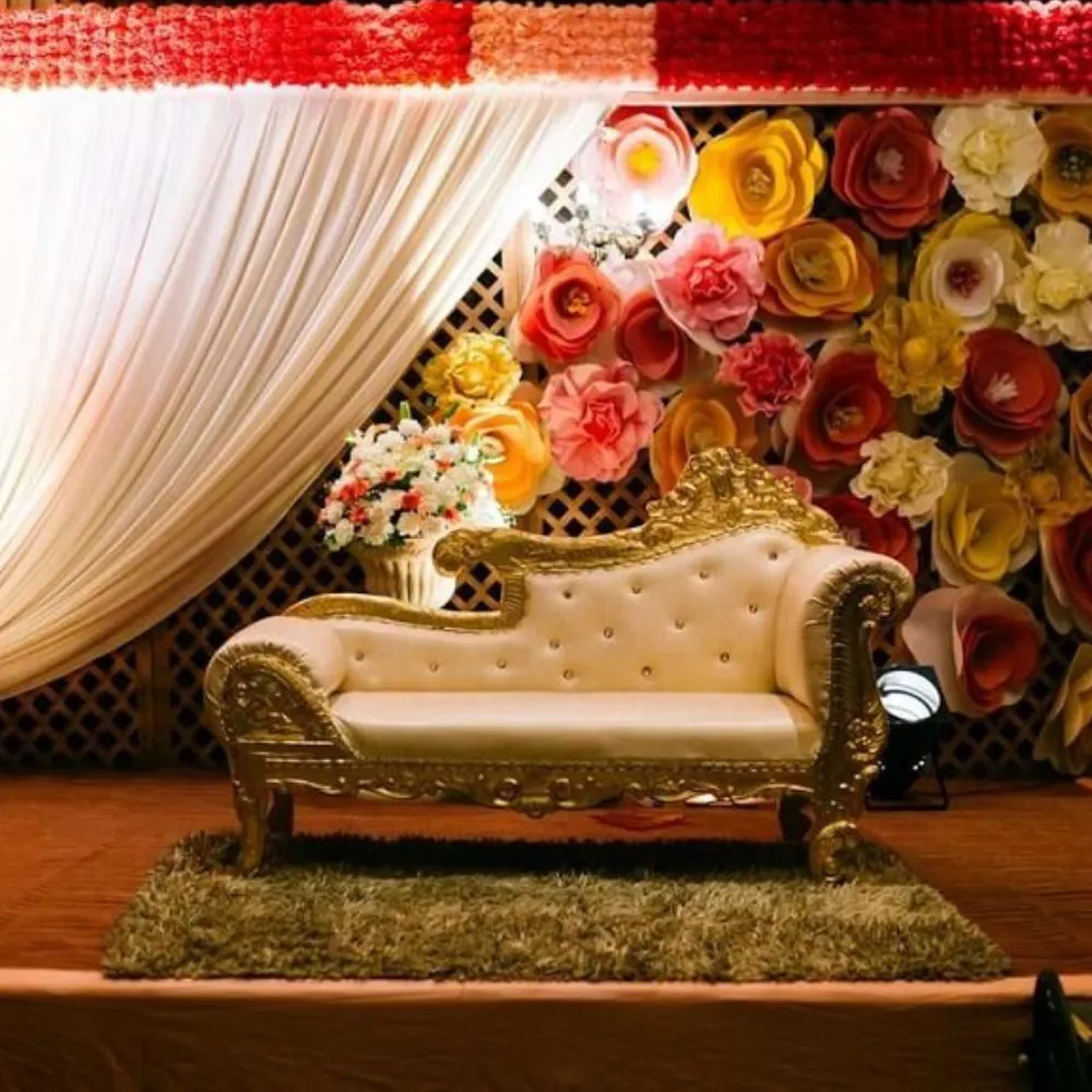 This beautiful wedding stage decoration is crafted to create a grand and luxurious atmosphere for a memorable wedding celebration, featuring an impressive 26-foot by 11-foot stage with a well-balanced 4-foot depth that offers both elegance and comfort. The setup is enhanced with a stunning yellow carton backdrop measuring 10 feet by 6 feet, complemented by beautifully designed yellow guards and a carved yellow sofa that adds a regal charm, while the wedding sofa provides a perfect seating arrangement for the couple during key moments of the ceremony. The decorative elements are carefully chosen to elevate the visual appeal, with mirror balls reflecting light gracefully and chain hangings adding depth and sophistication to the overall design. Seven candle chandeliers cast a warm and romantic glow, creating an enchanting ambiance that feels intimate yet grand, while flower vases introduce a soft natural touch that balances the bold color palette. This wedding stage decoration blends modern elegance with traditional beauty, making it an ideal choice for couples who want a visually striking, elegant, and unforgettable wedding stage experience.