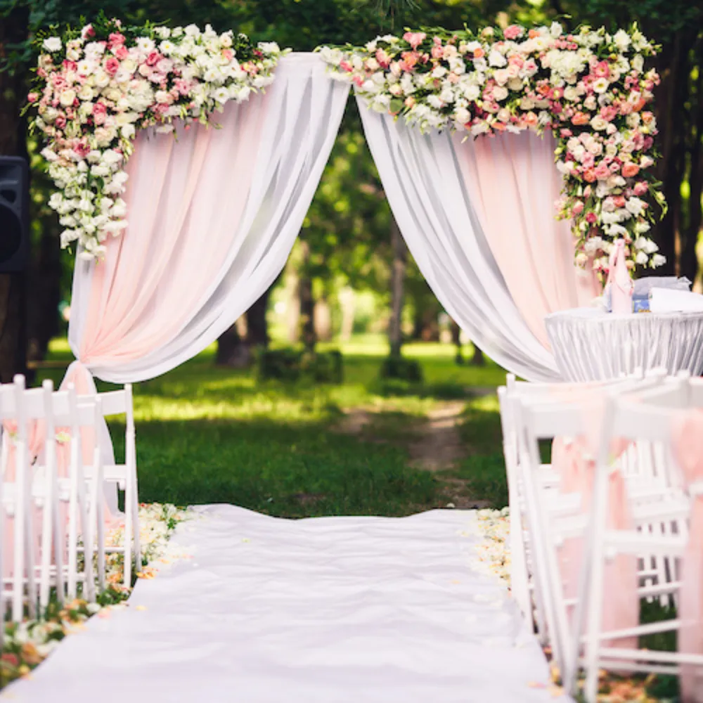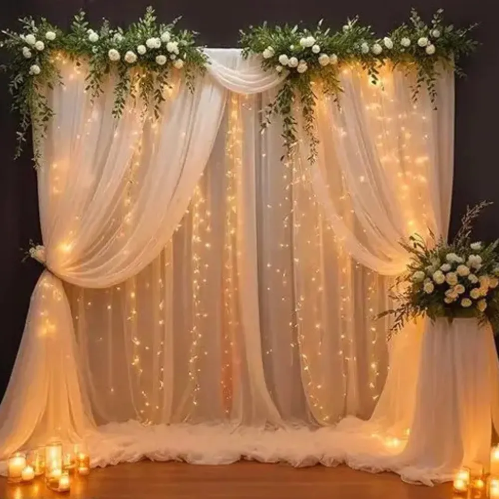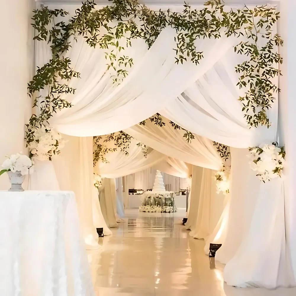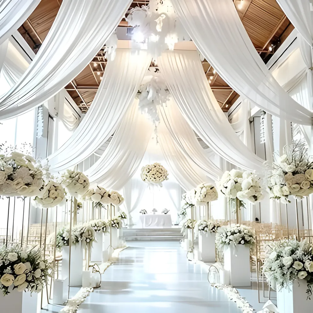 This beautiful white passage decoration creates a serene, elegant, and visually stunning walkway that leaves a lasting impression on guests. Stretching across a total of fifty feet, the passage is composed of five ten-by-ten–foot square sections, providing a grand and balanced layout that guides visitors through a sophisticated and cohesive design. Snow-white cartons form the main structure, giving the décor a clean, crisp, and luminous appearance, while three-by-seven–foot folded white cartons add depth and dimension, creating a layered and polished look. Artificial white flowers are delicately arranged throughout the passage, blending seamlessly with green leaves to add a touch of natural elegance and subtle contrast. Hanging white flowers in the first row introduce a graceful and flowing element, enhancing the vertical space and adding visual interest that draws the eye upward. The combination of pristine white tones with hints of green creates a tranquil and refreshing ambiance, perfect for weddings, anniversaries, or formal celebrations. This passage decoration transforms an ordinary entryway into a dreamy, photogenic, and memorable experience, making every step through it feel enchanting and special.