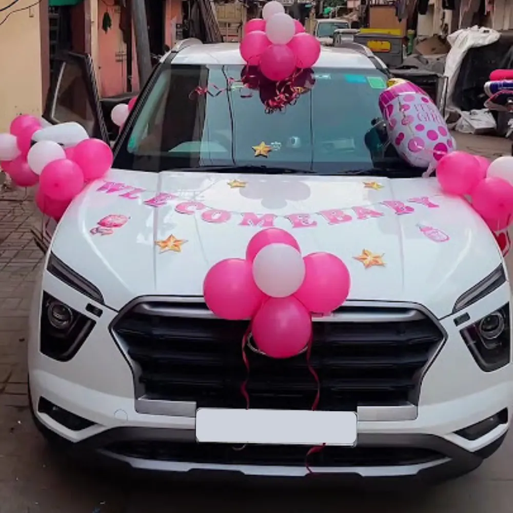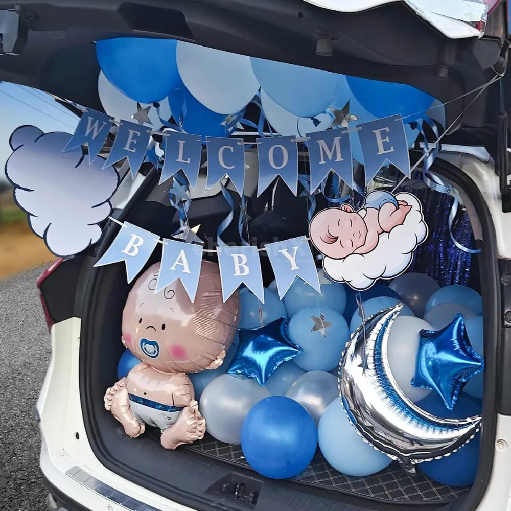 The inclusion of baby foil balloons and a charming baby foot balloon adds a sweet and playful element to the overall decoration, symbolizing love, joy, and new beginnings. Balloon and ribbon decorations placed on all sides of the car enhance the theme and ensure the vehicle looks beautifully decorated from every angle. The soft colors and gentle styling make this setup visually pleasing without appearing overwhelming. This decoration package is ideal for hospital pickups, baby shower arrivals, or special surprise moments. It transforms an ordinary car into a moving celebration, creating lasting memories and picture-perfect moments that will be cherished by family and friends.