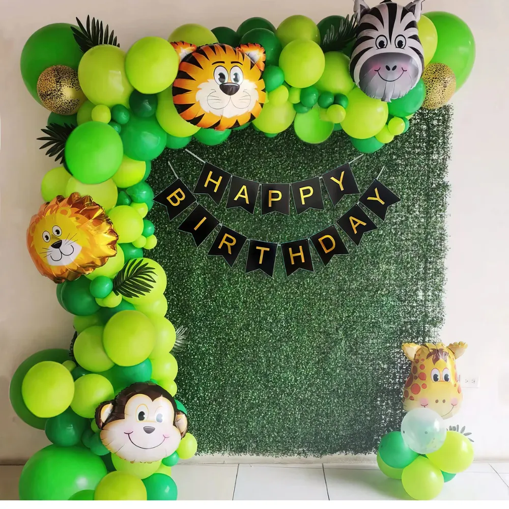 This delightful smiley face balloon décor with animal cutouts creates a cheerful and lively atmosphere that instantly brightens any celebration. The setup features an impressive eight-by-six–foot square balloon arch designed with refreshing green and blue balloons, forming a vibrant frame that welcomes guests with a burst of color. Alongside it, a charming three-and-a-half–foot white arch adds a soft and elegant touch, balancing the boldness of the main structure. A personalized birthday print flex enhances the display, giving the celebration a meaningful and festive backdrop. The golden and pink balloon fall cascades beautifully, adding movement and a hint of sparkle that catches the eye from every angle. Three adorable smiley face balloons bring joyful expressions into the décor, filling the space with warmth and a playful vibe. Two white balloon stands, each two feet tall, along with a matching pink stand, provide stylish support and additional visual height to the arrangement. Three animal cutouts add a fun, animated touch that children especially love, making the décor feel lively and engaging. A brown balloon guard completes the setup, tying all elements together with a polished finish. Altogether, this décor creates a charming, colorful, and heartwarming setting perfect for making unforgettable birthday memories.